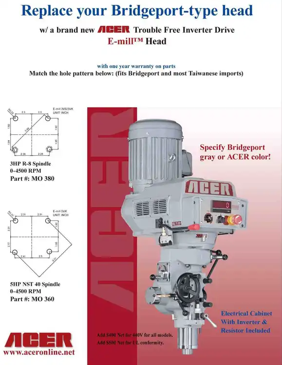 5 H.P. REPLACEMENT MILLING HEAD (NEW), ACER "E-MILL" , MILLING MACHINE UPGRADE