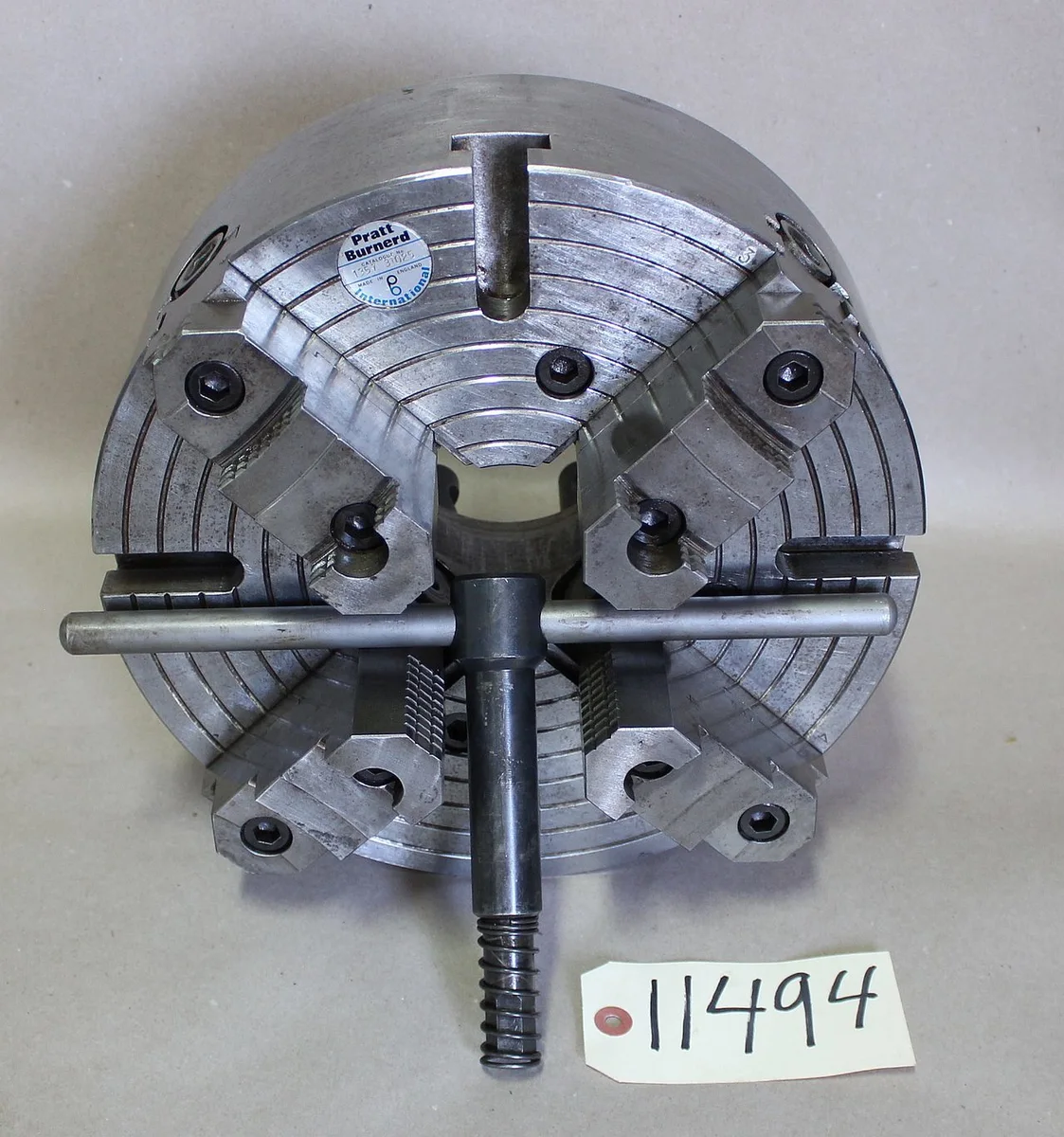 Pratt Burnerd Flat Back 12" 4-Jaw Chuck. 3" Thru Hole & D1-6 Camlock Back Mounting Plate. Reversible Top Jaws.