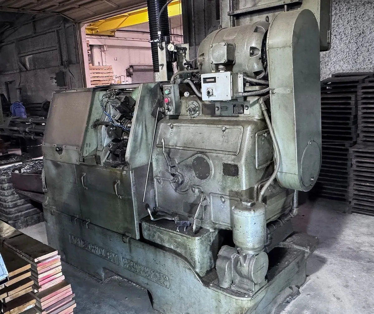 For sale: Used ACME GRIDLEY 9/16" RA automatic bar machine. Max collet capacity: Round 9/16", Square 25/64", Hex 31/64". Spindle speeds range 289-2885 RPM. Motor: 7.5 HP. Dimensions: 19' 2.5" L x 3'7" W. Net weight: 10,600 lbs.
