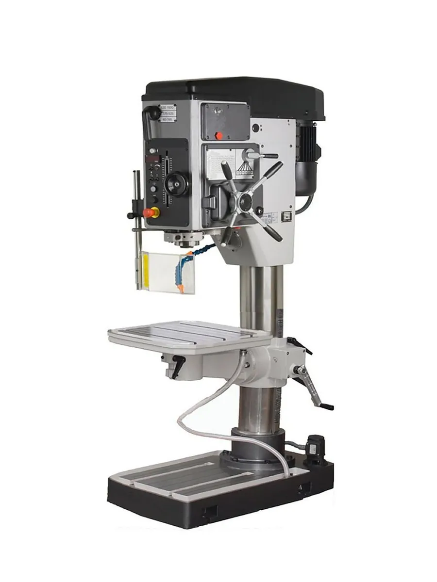 Clausing Iberdrill 28.34” Floor Drill Press Belt Drive 3 Speed Gear Head Drive, Adjustable Rotating Work Table, 72 – 1800 RPM by mechanical variable speed, 3.46” diameter quill, 4MT taper spindle, Electromagnetic clutch quill feed, 5.5 hp spindle motor, 1.97” drill capacity steel, 230/460 volt 3 Phase voltage