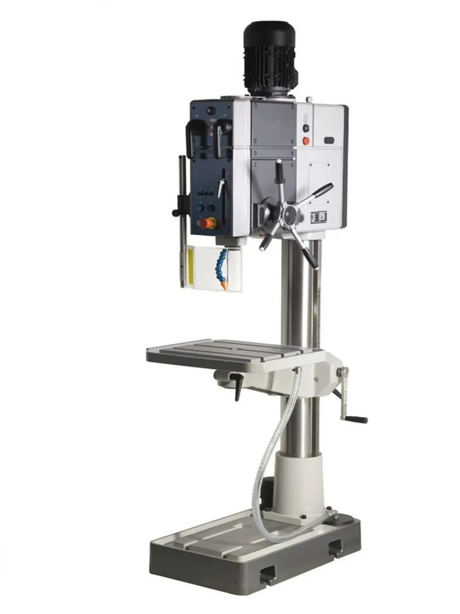 Clausing Iberdrill 27.56” Floor Drill Press Gear Head Drive, Adjustable Work Table and Base, 158 – 2222 RPM by 9 speed gear box, 2.95” diameter quill, 4MT taper spindle, electromagnetic clutch quill feed, 3 hp spindle motor, 1.57” drill capacity steel, 230/460 volt 3 Phase voltage