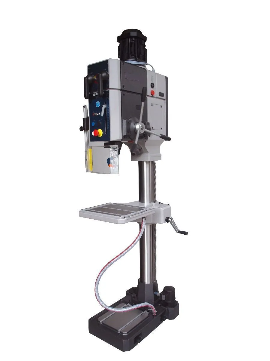 Clausing Iberdrill 23.62” Floor Drill Press Gear Head Drive, Adjustable Work Table and Base, 123 – 1714 RPM by 9 speed gear box, 2.95” diameter quill, 4MT taper spindle, mechanical clutch quill feed, 1.5 hp spindle motor, 1.26” drill capacity steel, 230/460 volt 3 Phase voltage