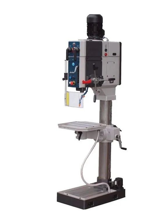 Clausing Iberdrill 27.56” Floor Drill Press Gear Head Drive, Adjustable Work Table and Base, 158 – 2222 RPM by 9 speed gear box, 2.95” diameter quill, 4MT taper spindle, mechanical clutch quill feed, 3 hp spindle motor, 1.57” drill capacity steel, 230/460 volt 3 Phase voltage