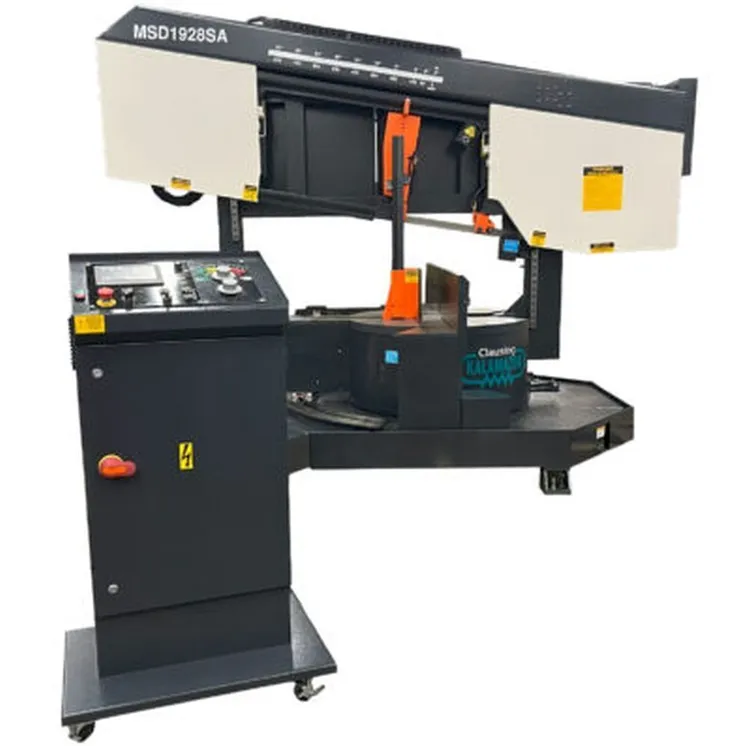 Introducing the Clausing Kalamazoo MSD1928SA Horizontal Miter Bandsaw—new and robust with a cutting capacity of 19" rounds and 16.5" x 28" rectangles, powered by a 7.5 hp motor. Features include variable speed, a mitering swivel head, and a 36” infeed roller table.