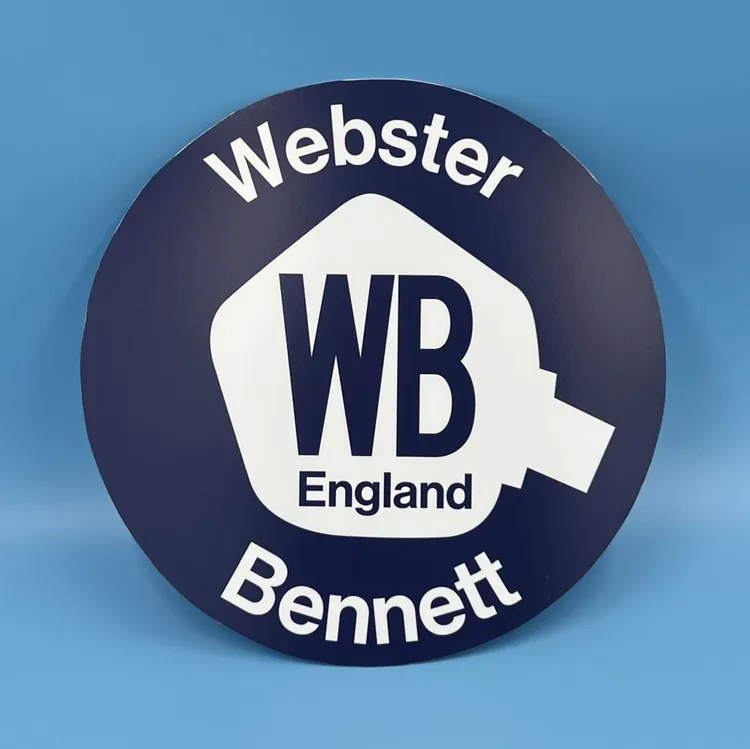 This original Webster & Bennett logo is 1/8" thick polystyrene x 11.25diam. with vinyl graphics and will go on all models of machine, D, S, DH, EH, M, EM, EV, R, Q, T, TE, ERNC, FRNC, DCM, DCH.